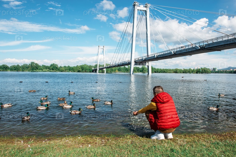 Мальчик кормит уток на берегу реки Енисей в Красноярске, Россия