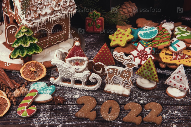 Имбирное печенье на новый 2022 год на деревянном фоне, рождественская тема