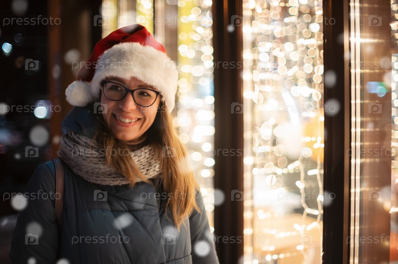Красотка в шапке Санты смотрит и мечтает в освещенной витрине магазина. Рождественские подарки, праздники или покупки на Новый год или Рождество концепции