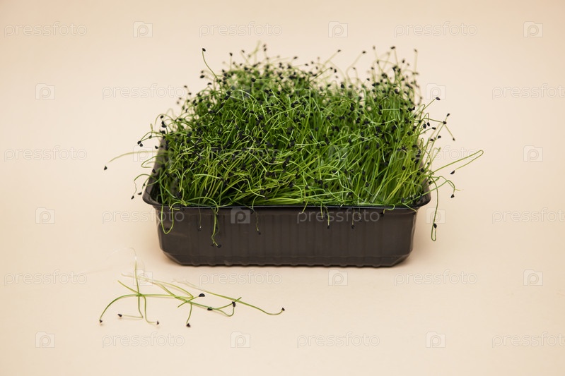 Микрозелень прорастает амарант на бежевом фоне. Концепция суперфуда и здоровой органической пищи