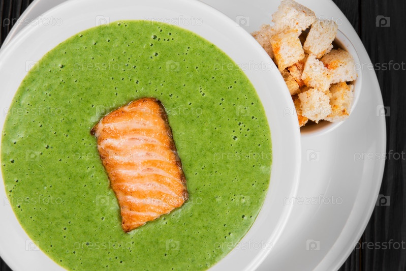 Вкусный зеленый шпинатный крем-суп с лососем