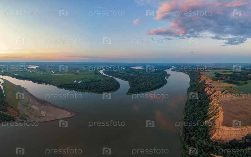 Воздушный вид с дрона на речной пейзаж в солнечный летний вечер. Вид сверху на сибирскую реку Обь с высоты в летний закат. Панорама, вид с высоты птичьего полета