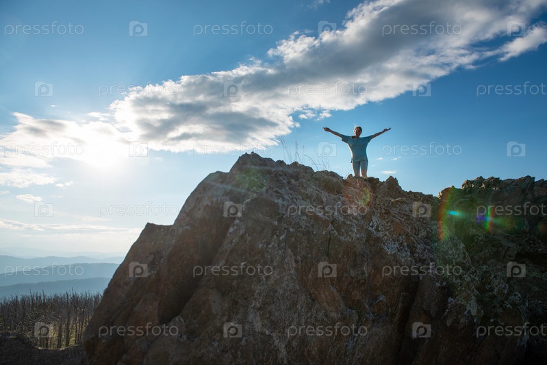 Внутренний туризм, путешествия, отдых и концепция свободы после пандемии - женщина на вершине Алтайской горы, красота летнего вечернего пейзажа