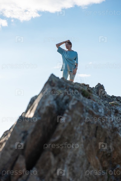 Внутренний туризм, путешествия, отдых и концепция свободы после пандемии - женщина на вершине Алтайской горы, красота летнего вечернего пейзажа