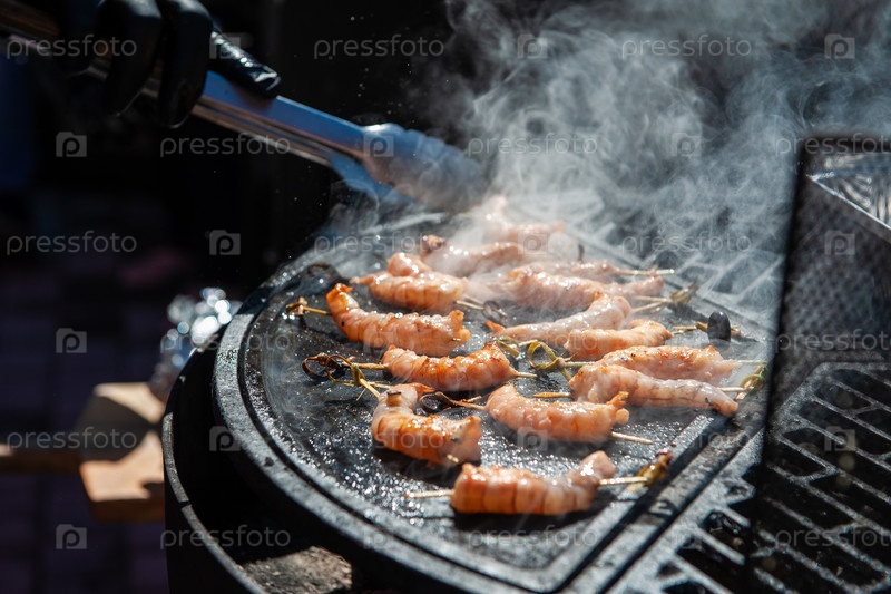 Профессиональный повар готовит креветки на гриле на открытом воздухе, концепция питания или кейтеринга