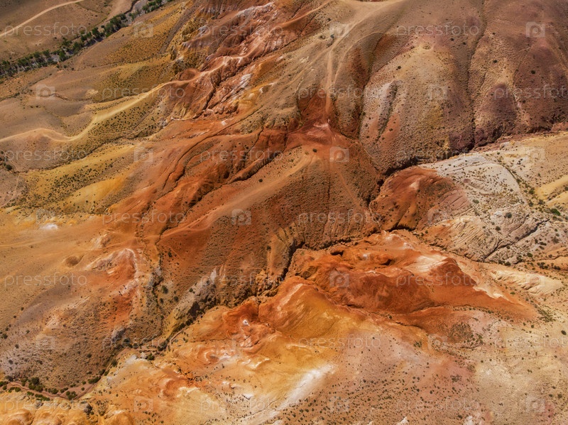 Аэрофотоснимок с беспилотника красочного эродированного рельефа Алтайских гор в желтых, коричневых и красных тонах