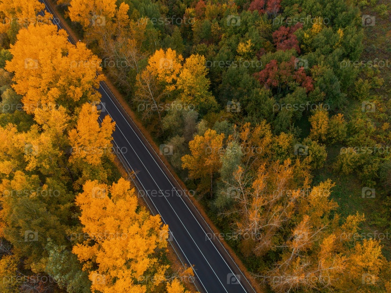 Вид с воздуха на дорогу в красивом осеннем лесу Алтая. Красивый пейзаж с пустой сельской дорогой, золотая осень на Алтае: деревья с красными, желтыми и оранжевыми листьями