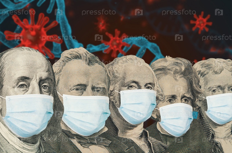 Разные американские президенты из долларовых банкнот с масками на фоне ковида. Концепция мирового финансового кризиса и пандемии