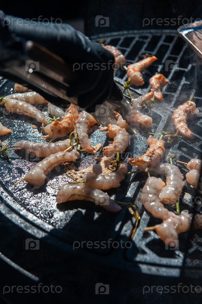 Профессиональный повар готовит креветки