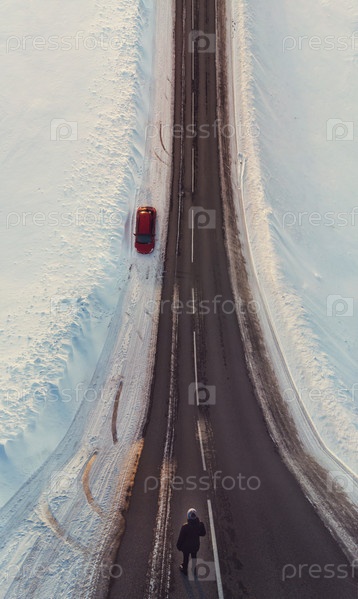 Сюрреалистическое изображение с необычной перспективой с женщиной на зимней дороге и автомобилем, одновременный вид сверху и обычный вид