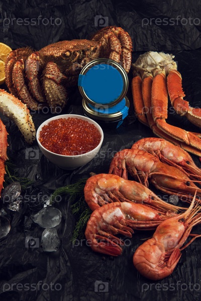 Набор из свежих морепродуктов: красная и черная икра, конечность волосатого краба, конечность краба-стригуна, дальневосточный камчатский краб