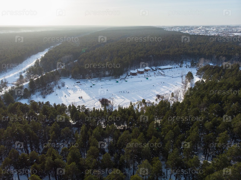 Вид с воздуха на зимнюю горнолыжную базу в сибирском лесу