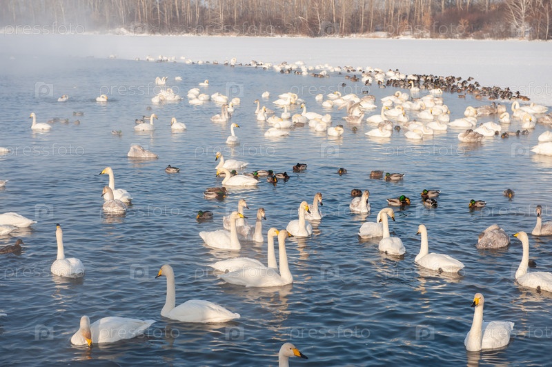 Красивые белые лебеди-кликуны плавают в незамерзающем зимнем озере. Место зимовки лебедей, Алтай, Сибирь, Россия