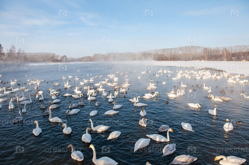 Красивые белые лебеди-кликуны плавают в незамерзающем зимнем озере. Место зимовки лебедей, Алтай, Сибирь, Россия