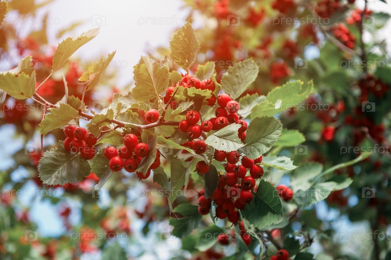 Красные ягоды боярышника однопестичного, известного как боярышник, на зеленом кусте