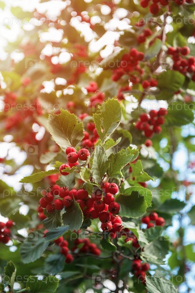 Красные ягоды боярышника однопестичного, известного как боярышник, на зеленом кусте