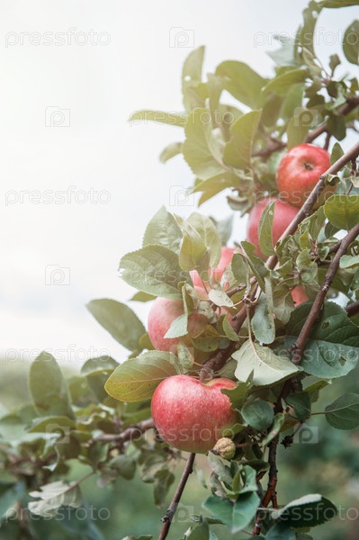 Яблоня с яблоками, органические натуральные фрукты в саду