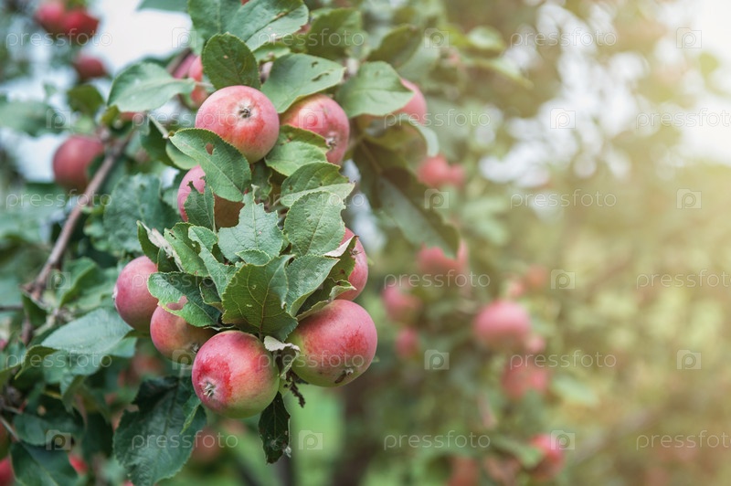 Яблоня с яблоками, органические натуральные фрукты в саду