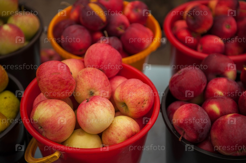 Красные спелые яблоки в ведре. Свежесобранные домашние яблочные фрукты