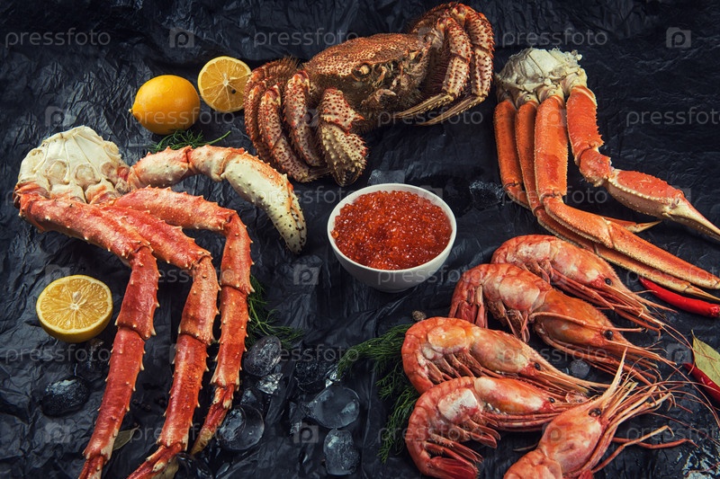 Набор морепродуктов: красная и черная икра, конечность волосатого краба, конечность краба-стригуна, дальневосточный камчатский краб