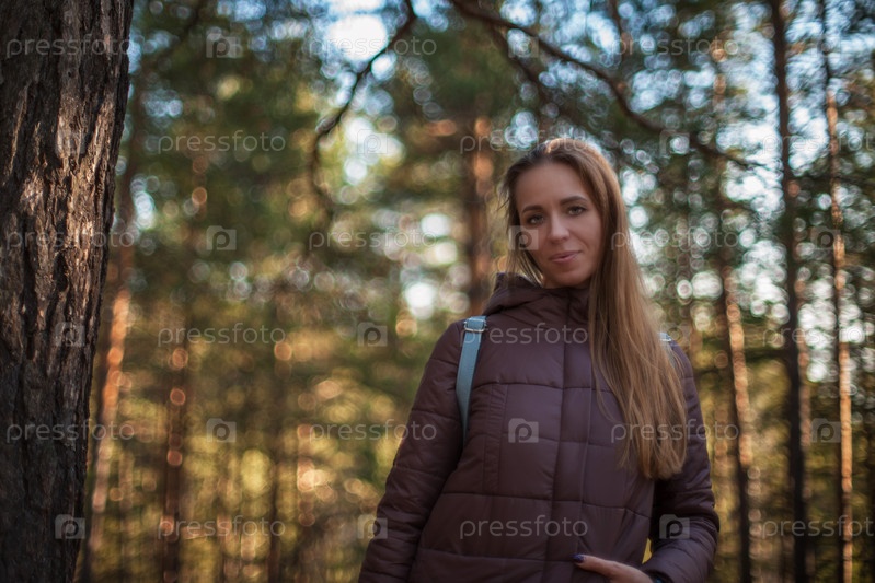 Довольно счастливая женщина позирует в лесу и смотрит в камеру