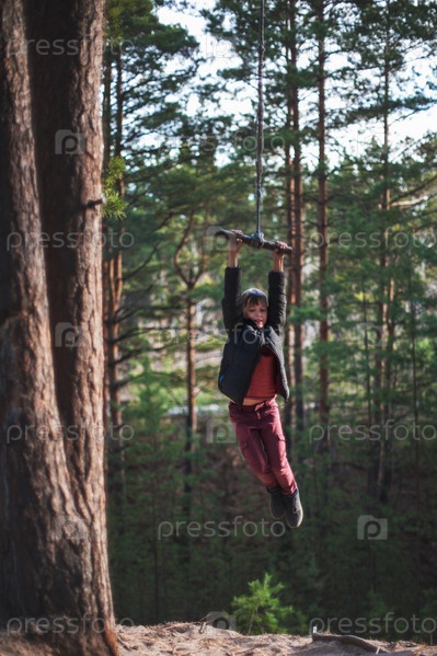 Мальчик-подросток на тарзанке в осеннем лесу в прекрасный солнечный день