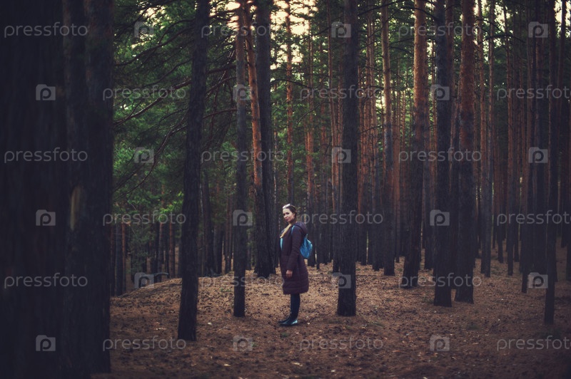 Довольно счастливая женщина позирует в лесу и смотрит в камеру