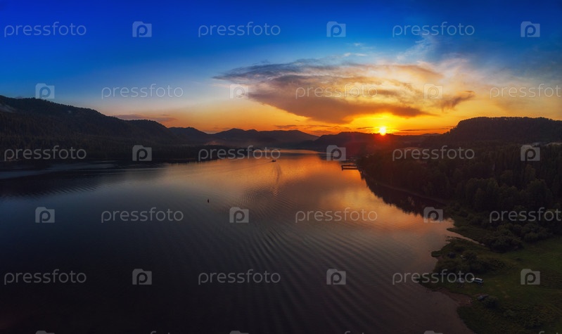 Вид с воздуха на Телецкое озеро в горах Алтая, Сибирь, Россия. Съемка с дрона. Красота панорамного снимка летним вечером