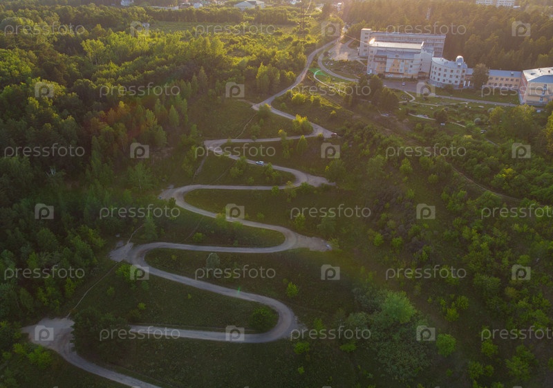 Вид сверху на извилистую дорогу в городе, снято с дрона