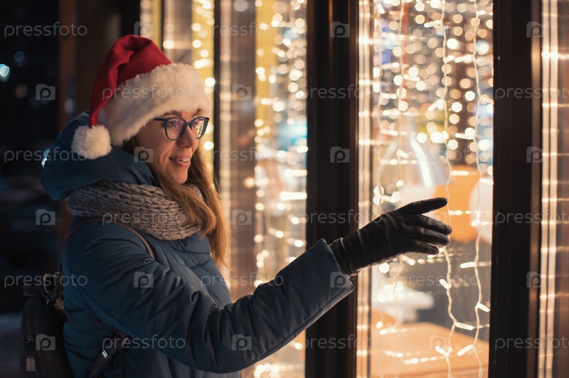 Красотка в шапке Санты смотрит и мечтает в освещенной витрине магазина. Рождественские подарки, праздники или покупки на Новый год или Рождество концепции