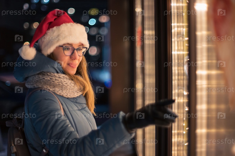 Красотка в шапке Санты смотрит и мечтает в освещенной витрине магазина. Рождественские подарки, праздники или покупки на Новый год или Рождество концепции