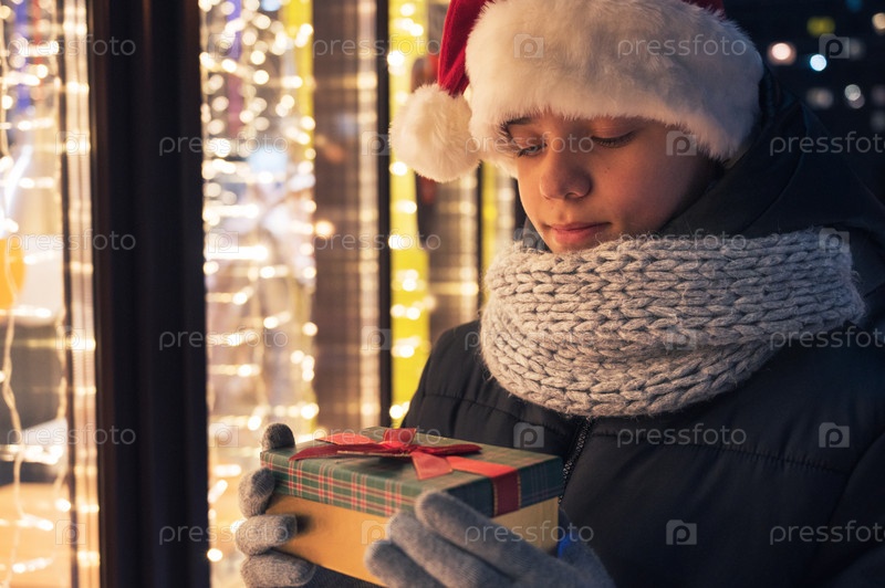 Мальчик в шапке Санты с коробкой подарков возле освещенной витрины магазина. Рождественские подарки, праздники или покупки на Новый год или Рождество