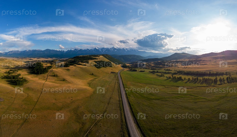 Чуйский тракт в горах Алтая. Одна из самых красивых дорог в мире. Снимок с воздуха с дрона
