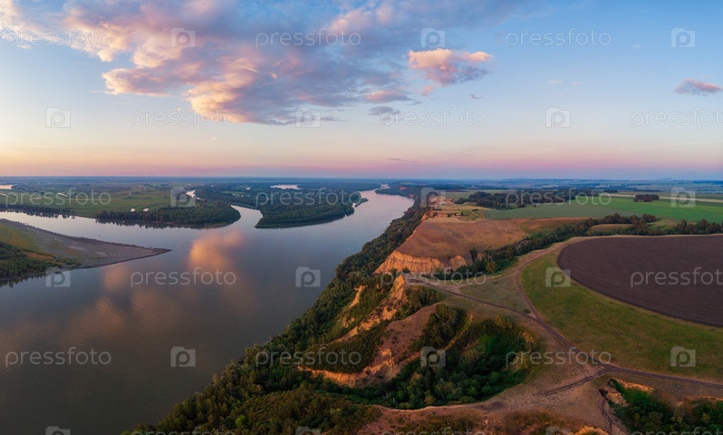 Воздушный вид с дрона на речной пейзаж в солнечный летний вечер. Вид сверху на сибирскую реку Обь с высоты в летний закат. Панорама, вид с высоты птичьего полета
