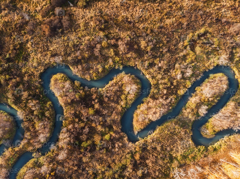 Вид с воздуха с беспилотника на осенний пейзаж с рекой