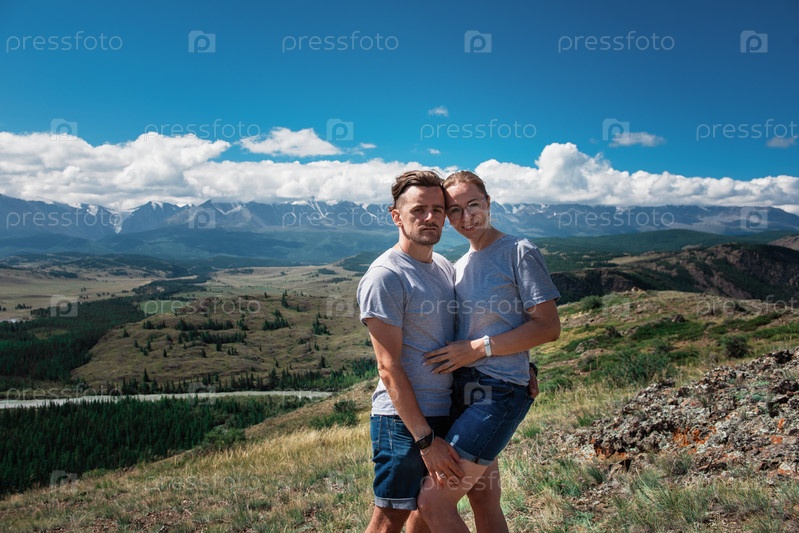 Влюбленная пара вместе на Алтайских горах, любуясь видом