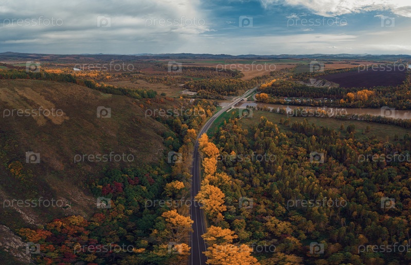 Вид с воздуха на дорогу в красивом осеннем лесу Алтая. Красивый пейзаж с пустой сельской дорогой, золотая осень на Алтае: деревья с красными, желтыми и оранжевыми листьями
