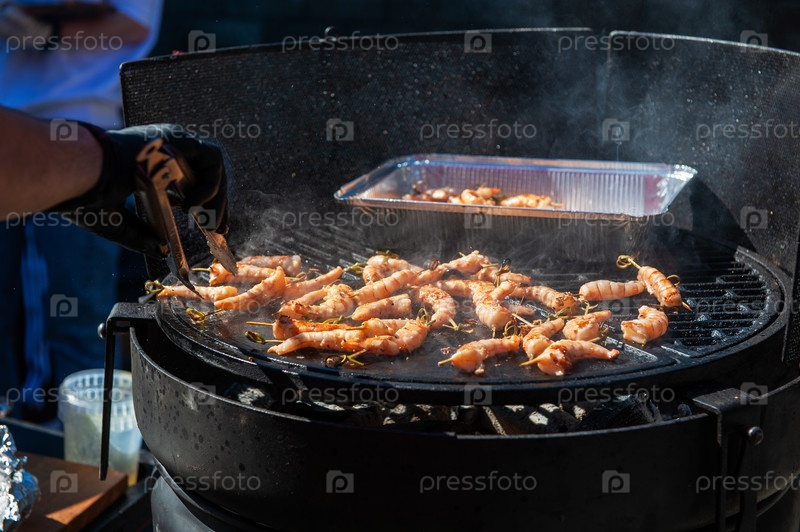 Профессиональный повар готовит креветки