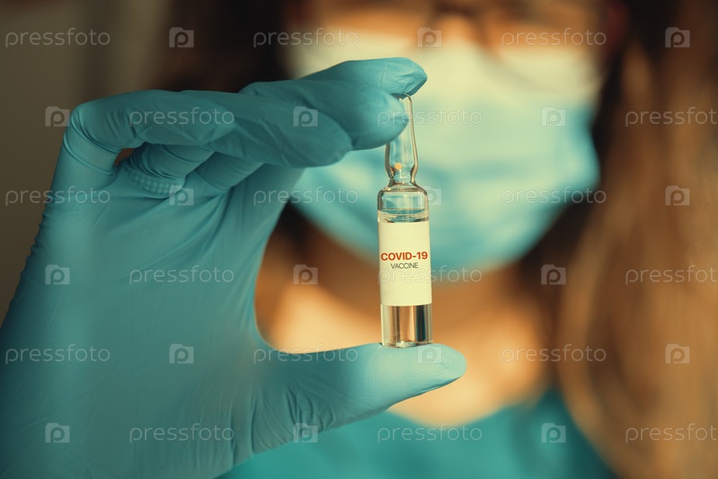Концепция вакцины от коронавируса: вакцина против COVID-19 в руке врача с синими защитными перчатками