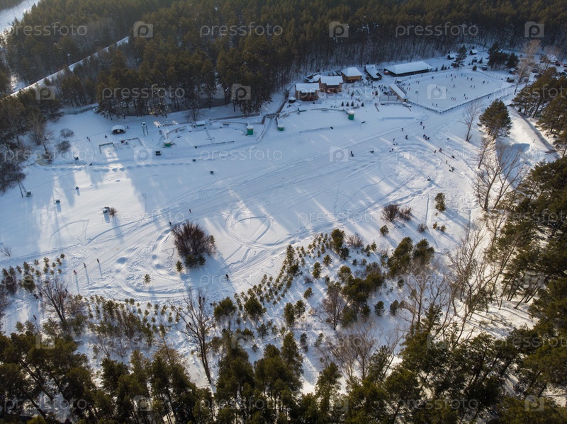 Вид с воздуха на зимнюю горнолыжную базу в сибирском лесу
