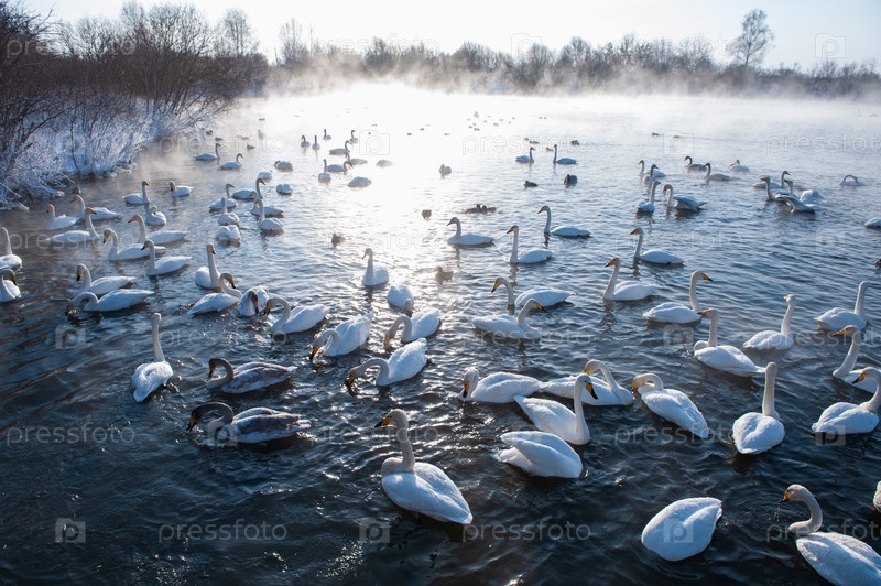 Красивые белые лебеди-кликуны плавают в незамерзающем зимнем озере. Место зимовки лебедей, Алтай, Сибирь, Россия