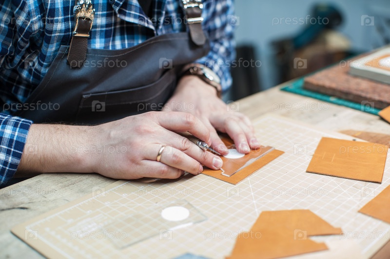Мужчина работает с кожаным текстилем в мастерской. Концепция ручного ремесленного производства кожаных изделий