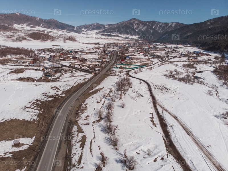 Вид с воздуха на дорогу в зимнем пейзаже Алтайских гор