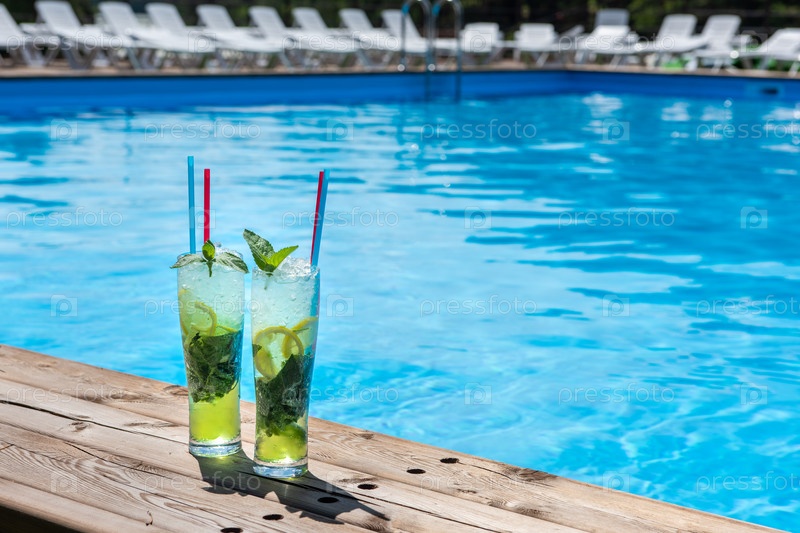 Два коктейля Мохито с лаймом и мятой в хайболе на фоне бассейна. Концепция летнего отдыха