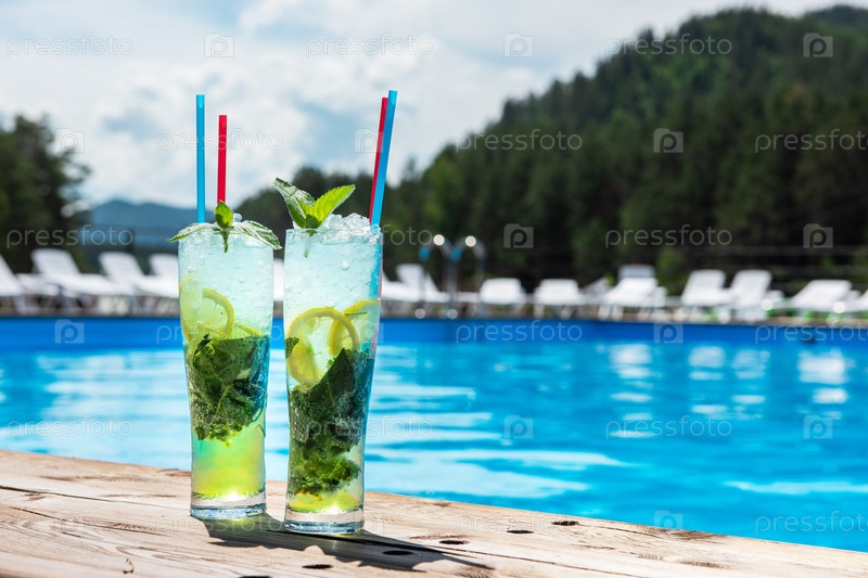 Два коктейля Мохито с лаймом и мятой в хайболе на фоне бассейна. Концепция летнего отдыха