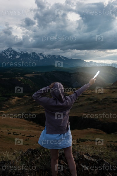 Женщина в синем платье летом в горах Алтая