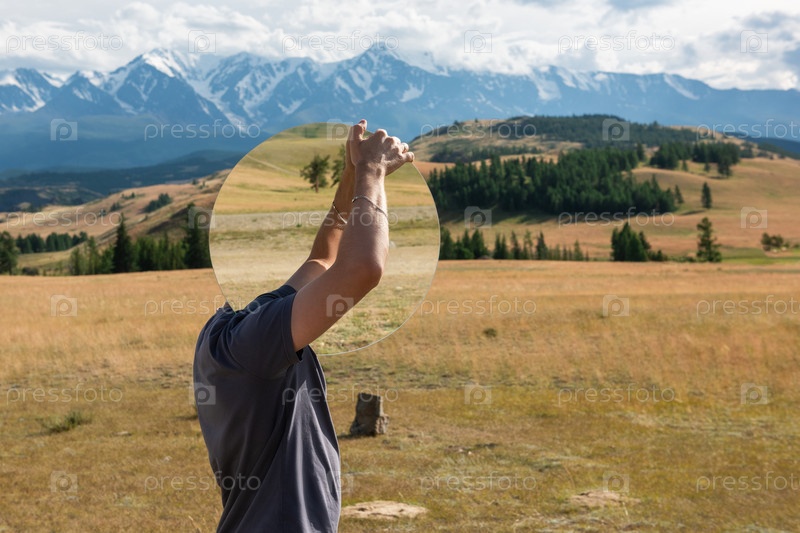 Человек стоит в летних горах Алтая в Курайской степи и держит круглое зеркало. Творческая концепция путешествия