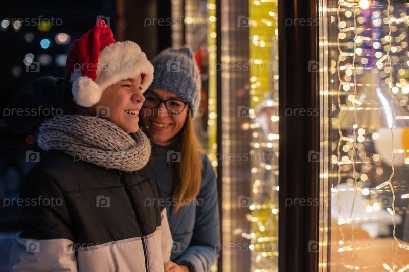 Красотка и ее сын в шапке Санты смотрят и мечтают в освещенной витрине магазина. Рождественские подарки, праздники или покупки на Новый год или Рождество концепции