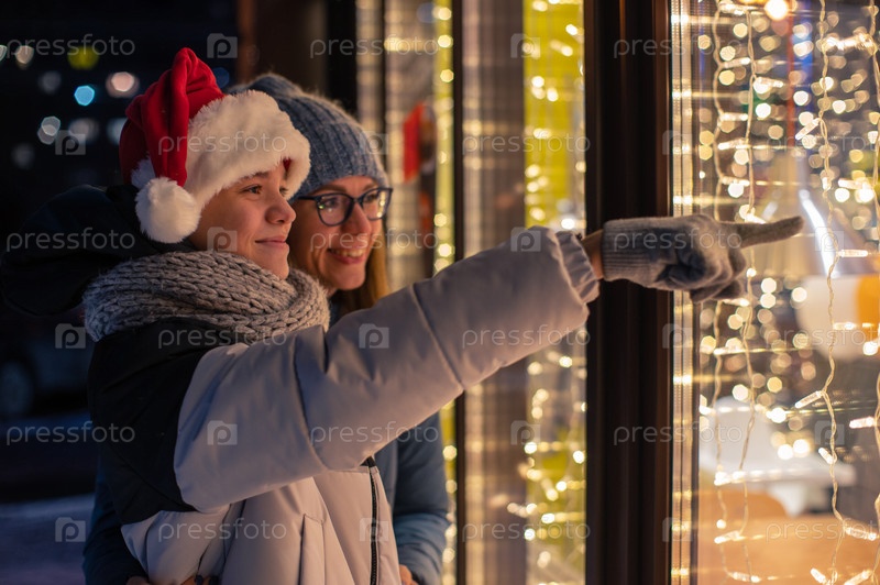 Красотка и ее сын в шапке Санты смотрят и мечтают в освещенной витрине магазина. Рождественские подарки, праздники или покупки на Новый год или Рождество концепции