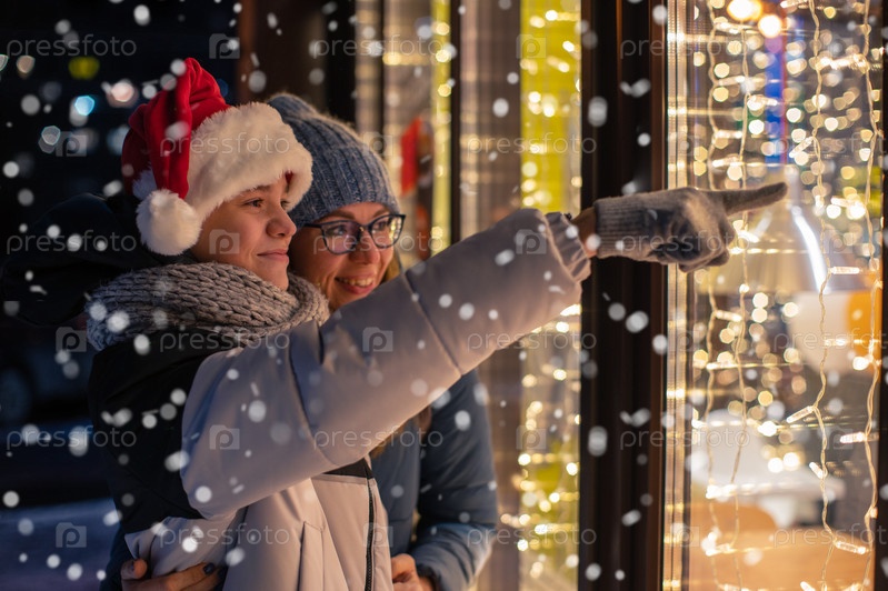 Красотка и ее сын в шапке Санты смотрят и мечтают в освещенной витрине магазина. Рождественские подарки, праздники или покупки на Новый год или Рождество концепции